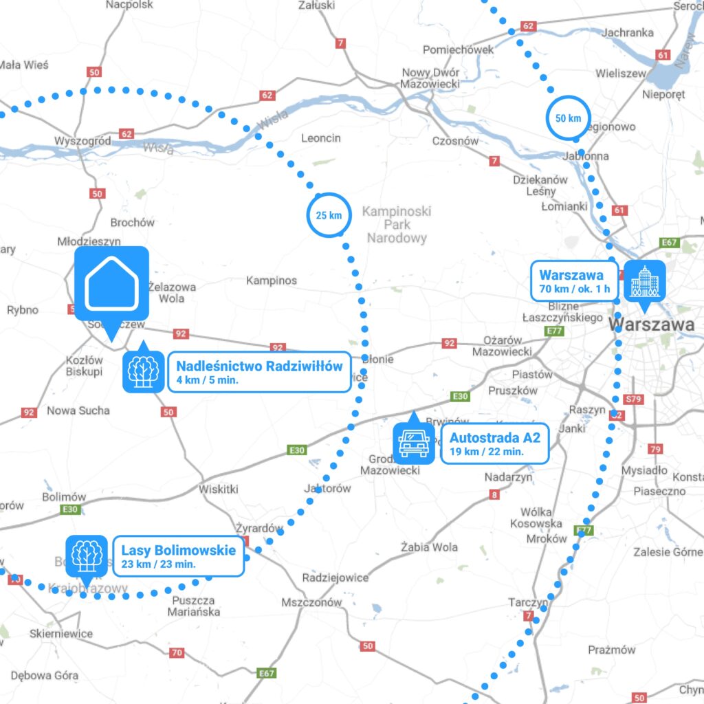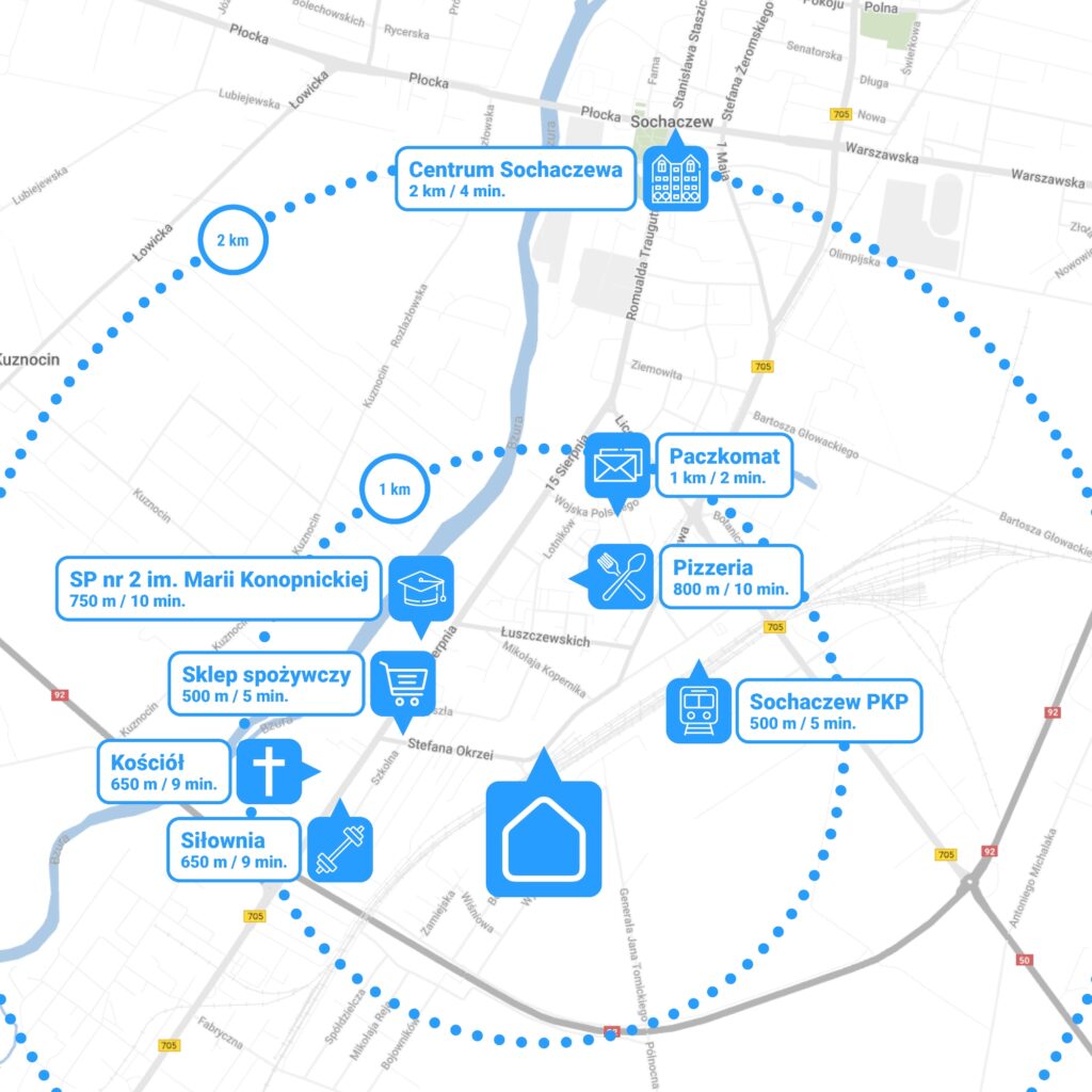 Inwestycja posiada świetną lokalizację, w bliskiej odległości dworca kolejowego, dzięki któremu przyszli mieszkańcy dotrą w szybki sposób do Warszawy lub Łowicza. Jest to idealny wybór dla osób podróżujących do pracy poza granice Sochaczewa lub pod wynajem.